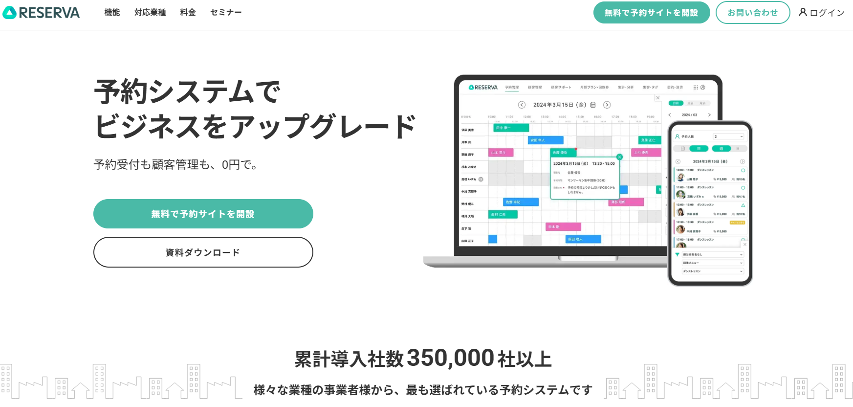 RESERVA(レゼルバ)は登録事業者数35万社を誇る国内トップクラスの導入実績を誇るSaaS型予約管理システムです。350種類以上におよぶ、様々な業種・業界に対応し、個人事業主から上場企業・公的機関の予約サイトにも活用されています。