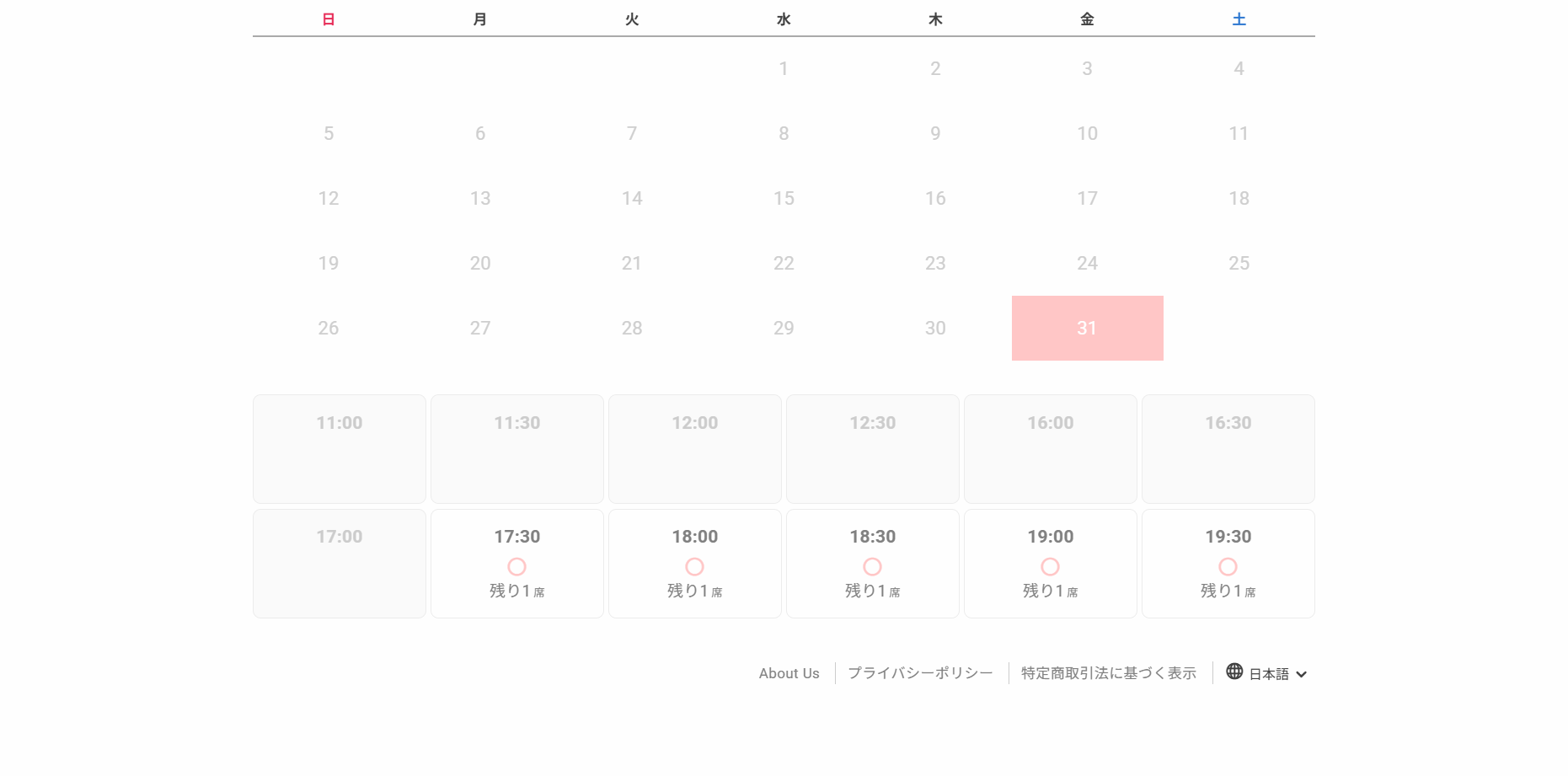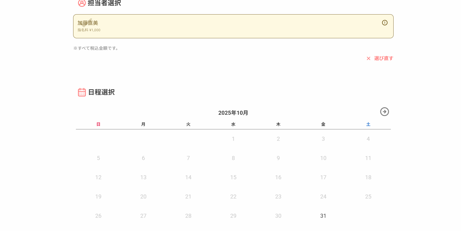 日程選択が担当者の選択画面に移動します。担当者を選択すると、その画面に予約可能な日程が表示されるようになります。(スタッフ指名ありタイプのみ)