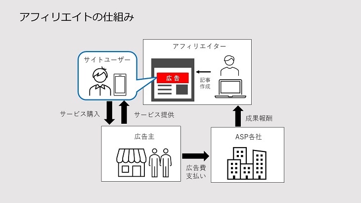 このようにアフィリエイト広告は、広告主、アフィリエイター、ASPの三者で成り立っています。