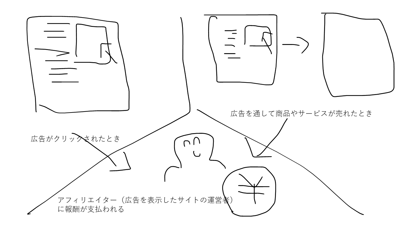 オンラインショップや個人サイトなどで販売されている商品やサービスの広告をWEBサイトに掲載し、その広告がクリックされたときや、その広告を経由して商品やサービスが販売された際に、ウェブサイトの運営者(アフィリエイター)に報酬が支払われます。