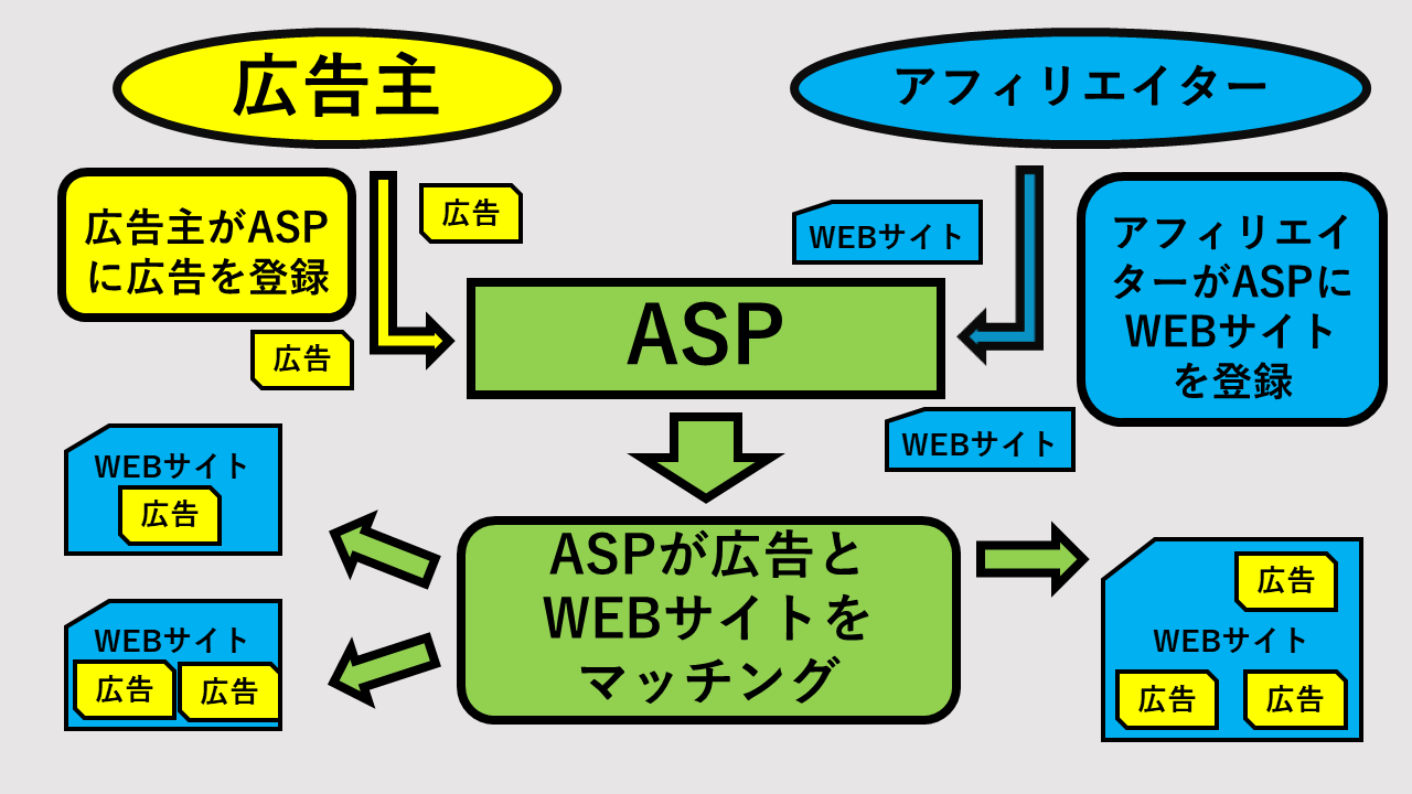 また、自分のWEBサイトに広告を表示することで収益を得ようとするアフィリエイターは、自分のWEBサイトをASPに登録し、ASPから広告案件を得ることで、自分のWEBサイトに広告を表示することができます。