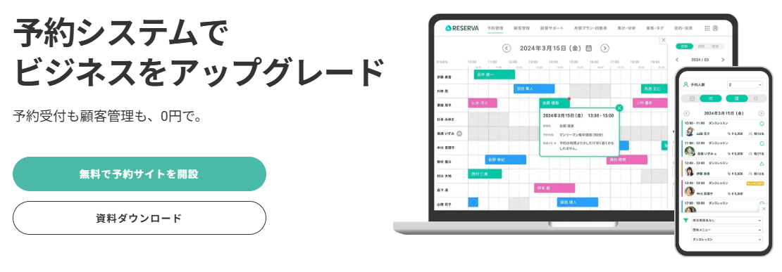 RESERVA(レゼルバ)は、導入数35万社を誇る、予約システムシェア国内トップクラスのクラウド型予約管理システムです。業界・業種問わずあらゆるビジネスに対応しており、350種類以上の業態で活用されています。アカウント発行から予約システム作成完了まで最短3分で、永久無料で使えるフリープランもあるため、導入コストを低くしたい・使用感を確かめてから導入したいといった事業者におすすめです。