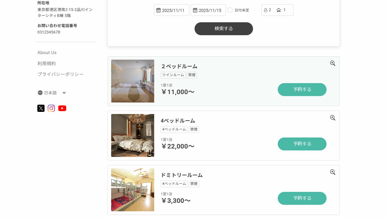 宿泊施設タイプは、予約枠から部屋数・宿泊人数・チェックイン日・チェックアウト日を選択し、予約するタイプです。