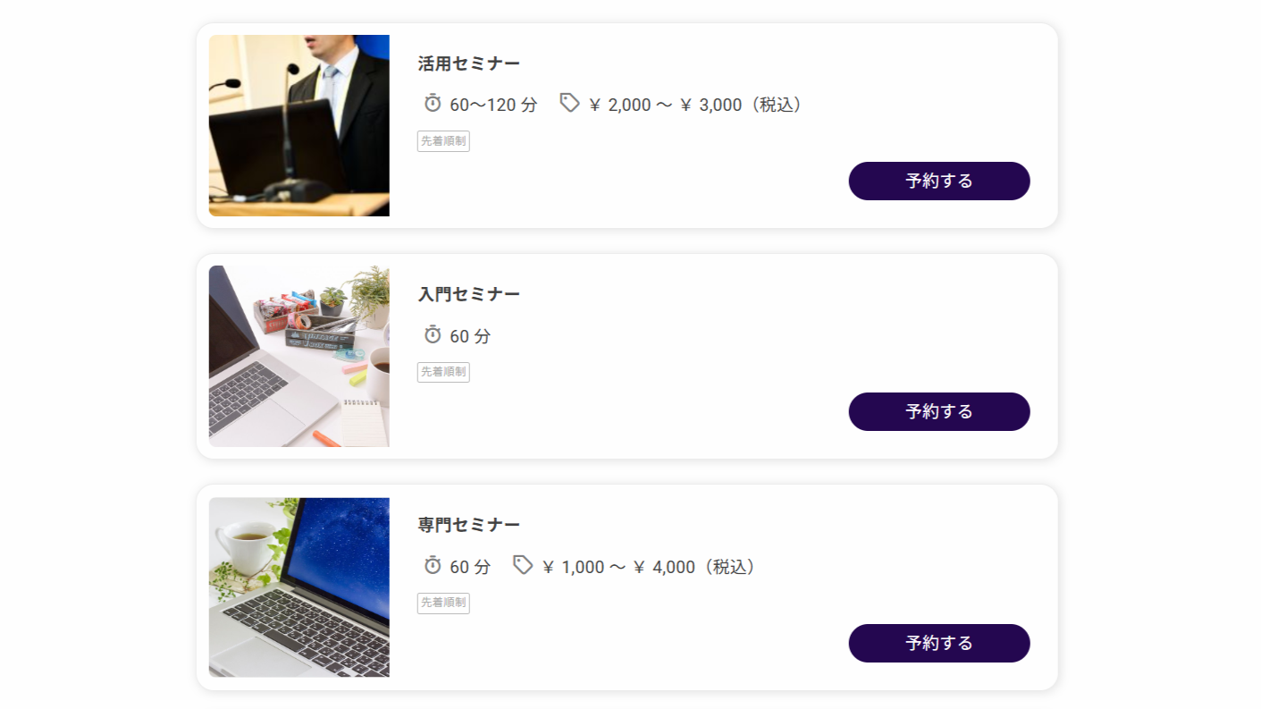 イベント・セミナータイプは、各メニューで設定された時間枠から選んで予約するタイプです。メニューAとメニューBなどが独立した時間に設定されているため、メニューAが減ってもメニューBやCなどの枠は減りません。セミナーの予約と似ている予約タイプの方におすすめです。