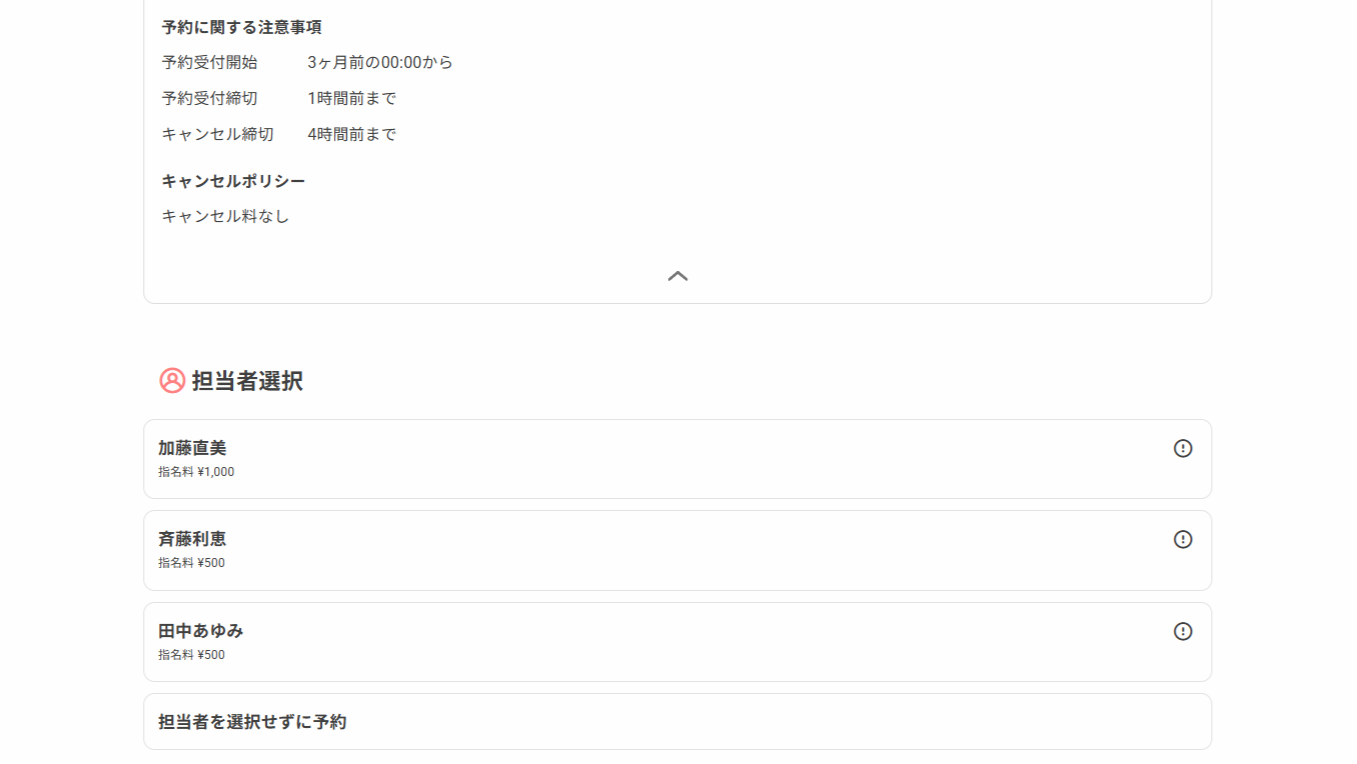 指名制度がない美容室、リラクゼーション、クリニック、士業、プライベートサロン、パーソナルジム、ボクシング、法律事務所、出張訪問、総合病院、クリニック、歯科、薬局、ホワイトニングサロン、予防接種、来店予約、アパレル、ジュエリー販売、旅行会社、人材派遣会社 など
