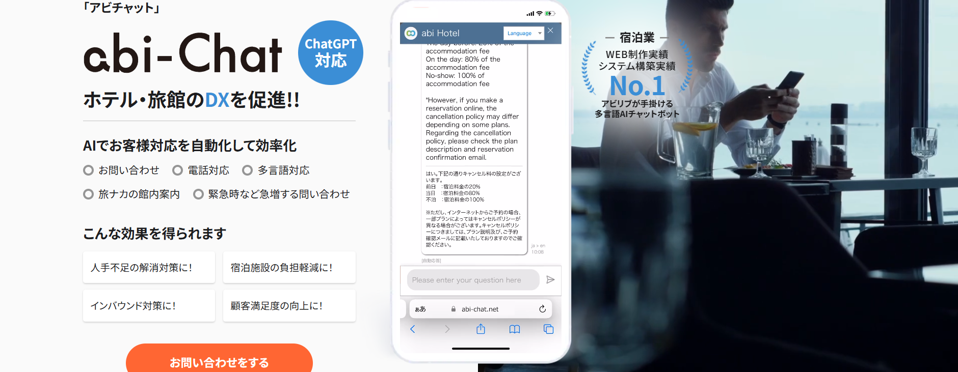 アビチャットは、宿泊観光業に特化した各種ツールやマーケティング支援を展開するアビリブが開発した、ホテル・旅館業に特化した多言語チャットボットです。日本語はもちろん、英語、中国語、韓国語をはじめ100言語以上をカバーし、訪日外国人の予約増加や販売拡大を支援しています。アビチャット導入により、メール問い合わせは64%、入電は40%減少するなど、高い成果を上げています。