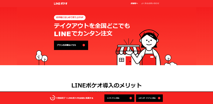 LINEが運営しているテイクアウト予約システムです。公式アカウント友だち追加数1000万人以上、利用可能地域は47都道府県とLINEが持つ強力なネットワーク網を使った、予約システムを導入することが可能です。