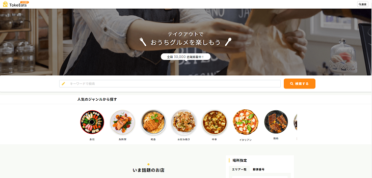 京都発の飲食系DXベンチャー企業、株式会社ランプが運営するテイクアウト予約システムです。テイクアウトに特化した店舗検索サイトとして、全国で30,000店舗以上が掲載(2020年12月現在)されており、テイクアウト予約システムを初期費用・月額利用料0円で導入することが可能です。