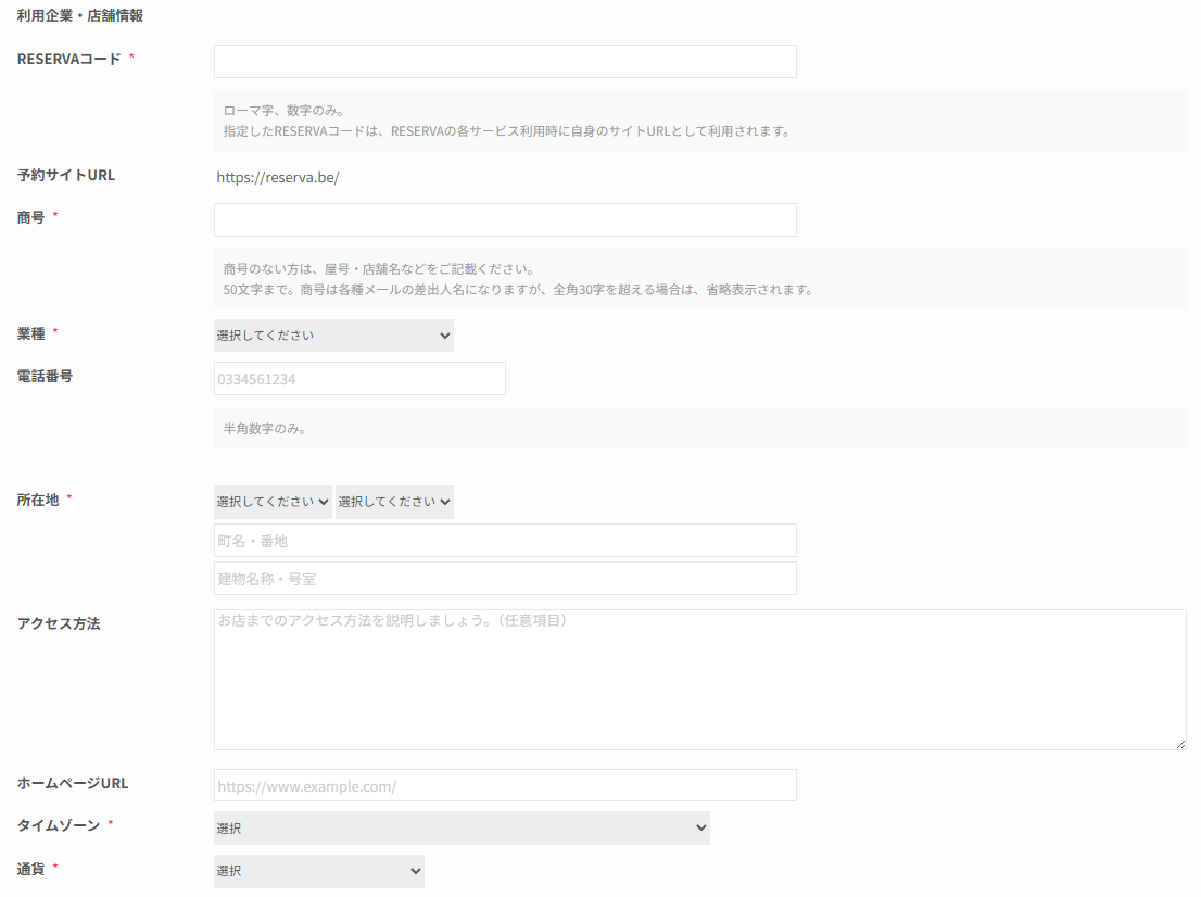 RESERVAコード、タイムゾーン、通貨は、設定後に変更できないため注意が必要です。