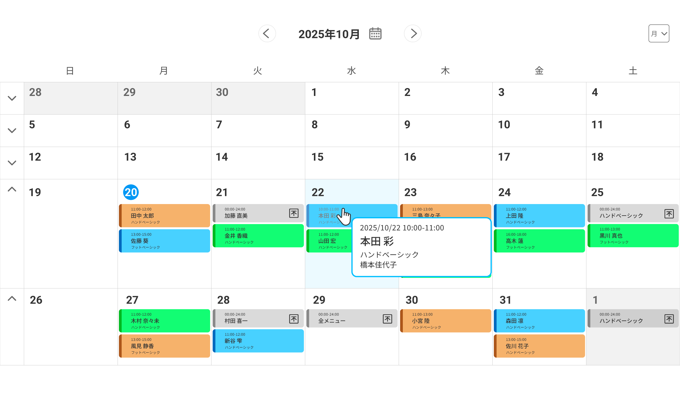 ・予約ブロックをマウスオーバーすると、予約の詳細情報が確認できます。